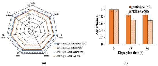 PEG has been widely used to stabilize AuNRs [32], so we prepared PEGylated Au-NRs and compared their stability with gelatin@Au-NRs produced at a 1:2 ration using a radar plot. Figure 3a represents the absorbance of gelatin@Au-NRs (1:2) and PEG@Au-NRs. The results show that both materials were stable for 60 min in the DMEM medium. The stability of gelatin@Au-NRs (1:2) compared to PEG@Au-NRs in PBS (pH 7.4) showed different results. The absorbance of PEG@Au-NRs was around the 80% radar mark, which is lower when compared to that of gelatin@Au-NRs, which is >90% at 60 min. The absorption of PEG@Au-NRs and gelatin@Au-NRs (1:2) were measured after 48 h and 96 h in PBS (pH 7.4) to observe the effectiveness of the gelatin coating with respect to PEG.