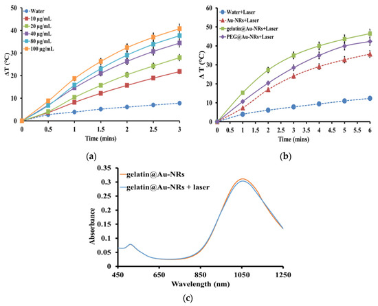 The laser irradiation of water showed a temperature change of less than 10 °C when irradiated for 3 min. In contrast, different concentrations of gelatin@Au-NRs from 10 µg/mL to 100 µg/mL at 3 min, showed ΔT increases from 21 to 42 °C (Figure 4a). For comparison, the ΔT were also studied for CTAB capped Au-NRs and PEG@Au-NRs. As shown in Figure 4b, laser irradiation of water shows a ΔT of about 10 °C when irradiated for 6 min, whereas laser irradiation of CTAB-Au-NRs, gelatin@Au-NRs, and PEG@Au-NRs under similar experimental condition, shows ΔT of 35 °C, 46 °C, and 41 °C, respectively. The results show that the gelatin biopolymer improved the thermal response of the Au-NRs with higher photothermal conversion efficiency than PEG@Au-NRs and CTAB capped Au-NRs. To evaluate the photostability of gelatin@Au-NRs, laser irradiation was performed at the wavelength of 1064 nm, at 0.9 W/cm2 for 3 min and analyzed using a UV-Vis-NIR spectrophotometer. The result demonstrated that no significant change was observed in the absorption spectrum of the gelatin@Au-NRs before and after irradiation (Figure 4c). The absorbance and LSPR maximum peak were almost the same even after irradiation at higher laser power, indicating that the gelatin@Au-NRs are photothermally stable enough to be employed as an efficient photothermal agent.