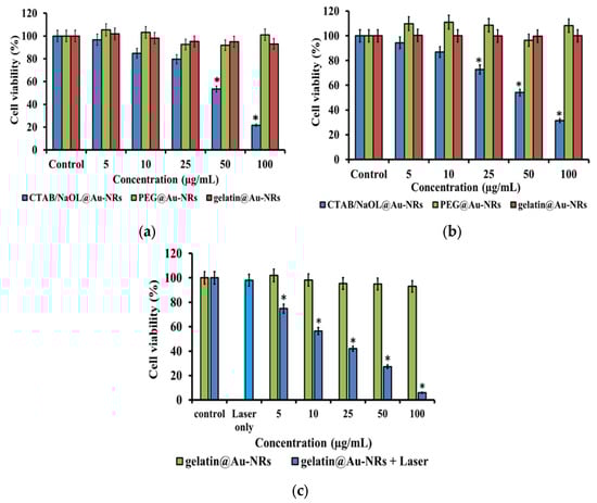 Cellular viability of CTAB@ Au-NRs, gelatin@ Au-NRs, and PEG@ Au-NRs on (a) KM-Luc/GFP cells (b) FM3A-Luc; at different concentrations. (c) In vitro laser cytotoxicity of gelatin@Au-NRs (1:2) at different concentrations under irradiation (1064 nm, 0.5 W/cm2) for 3 min on KM-Luc/GFP cell lines (* = p < 0.05).
