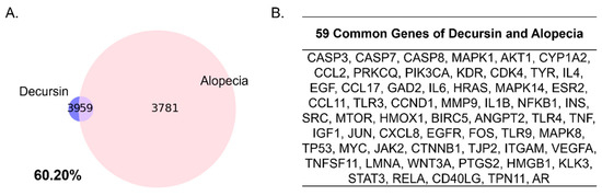A comparison between Decursin and alopecia. (A) Venn diagram of intersection targets between the Decursin network and the gene sets of alopecia. (B) Common genes of Decursin and alopecia.