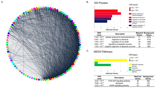 The Decursin network was constructed from 98 genes. The network was composed of 98 nodes, which are target genes of Decursin, and 7595 edges, which show the connections between nodes (Figure 2A). Based on FDR-value, CIA-related pathways of the network in GO Process and KEGG Pathway, were detected. GO annotation of functional enrichment analysis revealed that Decursin-targeted genes were mainly associated with cellular response to chemical stimulus, response to chemical, regulation of cell death, regulation of apoptotic process, and negative regulation of apoptotic process (Figure 2B), with high significant FDR values. Among 98 genes of the Decursin network, 71, 81, 54, 51, and 39 genes (72.44%, 82.65%, 55.10%, 52.04%, and 39.80%, respectively) were matched with the terms of GO process; cellular response to chemical stimulus, response to chemical, regulation of cell death, regulation of apoptotic process, and negative regulation of apoptotic process, respectively. In addition, KEGG enrichment analysis showed that PI3K-AKT signaling pathway, apoptosis, and MAPK signaling pathway, were predicted as pathways of the Decursin network (Figure 2C). Moreover, 30, 21, and 25 genes of Decursin-targeted genes were overlapped with the KEGG PI3K-AKT signaling pathway, apoptosis, and MAPK signaling pathway, showing the 30.61%, 21.43%, and 25.51% matching, respectively.