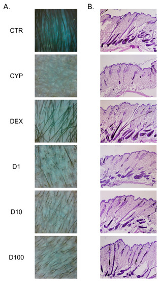 - Paus, R.; Handjiski, B.; Eichmüller, S.; Czarnetzki, B.M. Chemotherapy-induced alopecia in mice. Induction by cyclophosphamide, inhibition by cyclosporine A, and modulation by dexamethasone. Am. J. Pathol. 1994, 144, 719–734. [Google Scholar] [PubMed]