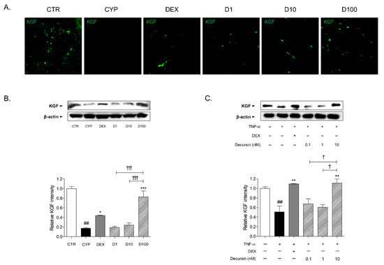 CYP injection led to reduction of keratinocyte (KGF)+ expression in the skin tissues, compared to skin tissues of the CTR group. Concentrations of 1, 10, and 100 μM of Decursin had an increasing effect on KGF+ expression of skin tissues in CIA mice (Figure 4A). In addition, the protein expression of KGF was significantly increased in the 100 μM of Decursin-treated skin tissues (Figure 4B). In the 10 nM of Decursin-treated cells, the KGF protein expression was markedly incremented, when compared with tumor necrosis factor-α (TNF-α)-sensitized HaCaT keratinocytes (Figure 4C).