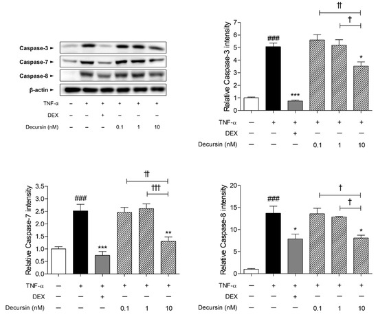 The caspase expressions in the HaCaT keratinocytes were significantly higher than that in the non-treated cells. Increased rates of caspase-3, -7, and -8 in the TNF-α-sensitized cells were 5.07, 2.52, and 13.70, respectively, compared to the non-treated cells. Treatment with 10 nM of Decursin dose-dependently decreased the increment of protein levels of caspase-3, -7, and -8, induced by TNF-α in HaCaT cells (Figure 5). The percentages of decrease in caspase-3, -7, and -8 were 30.41%, 48.27%, and 41.07%, respectively.