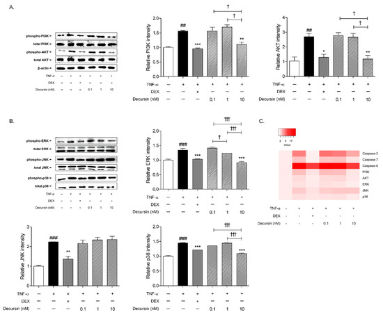 Effects of Decursin on PI3K/AKT and MAPKs pathway in keratinocytes. (A) Protein expressions of PI3K and AKT in TNF-α-sensitized HaCaT keratinocytes. (B) Protein expressions of ERK, JNK, and p38 in TNF-α-sensitized HaCaT keratinocytes. Results are presented as mean ± standard error of the mean and Tukey’s multiple comparison tests were used to determine the statistical significance. ## p < 0.01 and ### p < 0.001 vs. non-treated cells; * p < 0.05, ** p < 0.01, and *** p < 0.001 vs. TNF-α-sensitized cells; † p < 0.05 and ††† p < 0.001 vs. experimental TNF-α-sensitized and Decursin-treated cells. (C) Heatmap color intensity of protein expressions.