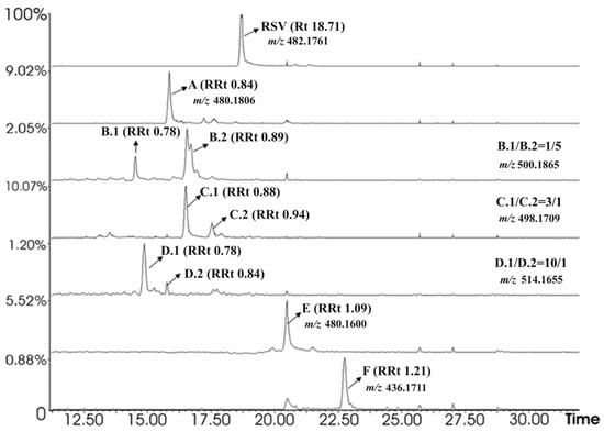 Extracted ion chromatograms of RSV (Rt 18.71) and gamma radiation-induced degradation products at 1000 Gy with observed relative retention time (RRt). Intensities of degradation products are normalized to the RSV principal peak. Peak areas of degradation peaks are expressed as percent area of the RSV principal peak. Fraction of extracted peak masses of B.1/B.2, C.1/C.2, and D.1/D.2 is calculated by dividing isobaric peak areas.