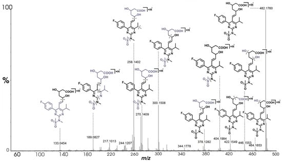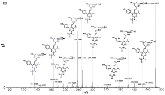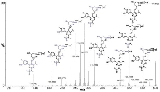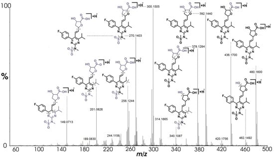 Compound A was eluted and detected at relative retention time (RRt) 0.84 in the TIC (Figure 2). The compound [M + H]+ ion was observed at m/z 480.1806, which corresponds to the elemental composition of C22H30N3O7S. The proposed molecular formula of compound A differs from the RSV formula (C22H29N3O6FS) by the presence of additional atoms: oxygen and hydrogen, and the absence of a fluorine atom. As it is presented in Figure 4, the MS/MS analysis of degradation product A showed the same fragmentation pattern as RSV with the mass shift of 1.9957 Da on average, except for two fragments detected in the low mass region (m/z 199.0873 and 131.0496). Mass differences and fragmentation pattern indicated that the molecule of product A contains a hydroxyl group at the position of the fluorine substituent. The average mass shift of 1.9956 Da complements the mass difference of fluorine and hydroxyl radical, 18.9984 Da and 17.0027 Da, respectively. Therefore, it is proposed that compound A resulted by radical substitution of fluorine atom on RSV molecule (Scheme 1) and the chemical name is proposed as (E)-7-(4-(4-hydroxyphenyl)-6-isopropyl-2-(N-ethylmethylsulfonamide)pyrimidin-5-yl)-3,5-dihydroxyhept-6-enoic acid.
