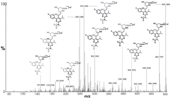 The formation of B.1 in difference to B.2 was confirmed by diagnostic fragments m/z 175.0736 and 147.0663 as seen in the MS/MS spectrum of the hydroxylation product B.1 (Figure 5). Besides two named diagnostic fragments, the remaining ions were the same in observed MS/MS spectra of both B.1 and B.2 product. Detection of both products could be attributed to the maximum sensitivity and resolution due to the utilization of nanoUPLC. The hydroxylation of RSV was additionally supported by the neutral loss of water molecule (18.0098 Da) from the precursor ion, m/z 500.1865 → m/z 482.1767 as is presented in Figure 5. The names of compounds B.1 and B.2 are proposed as 7-(4-(4-fluorophenyl)-6-isopropyl-2-(N-methylmethylsulfonamide)pyrimidin-5-yl)-3,5,6-trihydroxyheptanoic acid, and 7-(4-(4-fluorophenyl)-6-isopropyl-2-(N-methylmethylsulfo namide)pyrimidin-5-yl)-3,5,7-trihydroxyheptanoic acid, respectively.