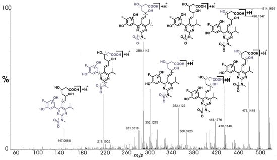 Compounds D.1 and D.2 were eluted and detected at RRt 0.78 and RRt 0.84, respectively, as it is shown in TIC (Figure 2). In the MS spectra, signals derived from [M + H]+ ions were observed at m/z 514.1655. This corresponds to elemental composition C22H29N3O8FS, the same for both products. Precursor ions of D.1/D.2 relative to products C.1/C.2 and RSV were characterized by a mass increment of 15.9946 Da and 31.9895 Da, respectively. Besides, fragment ions signals observed at m/z 496.1547, 478.1418, 436.1346, and 302.1279 showed the same mass shift of 15.9949, on average, compared to the MS/MS fragment ions signals of C.1/C.2 (Figure 7). The shifted fragment ions signals showed the same mass increment relative to the estimated relationship between C.1/C.2 and RSV, which indicates the presence of two hydroxyl groups in the fluorophenyl moieties in the structures of D.1/D.2. Therefore D.1/D.2 can be considered as derivatives of C.1/C.2, resulting from the substitution of a hydrogen atom in the fluorohydroxyphenyl ring with a second hydroxyl radical. As can be observed in Figure 2, one of the double-substituted products was formed in significantly higher quantity relative to the other. After D.1/D.2 MS/MS and spectral differential display analysis, it was not possible to establish exact position of the second hydroxyl group in the fluorohydroxyphenyl ring or to pinpoint diagnostic peaks for specific compound. It can only be supposed, based on the ratio of C.1/C.2 formation, that position next to the fluoro substituent is more favorable for a hydroxyl radical attack than other positions in the benzene ring. The mechanism responsible for the formation of D.1/D.2 from C.1/C.2 is most likely analogous to that proposed for giving rise C.1/C.2 from RSV. Chemical name of product D.1 was proposed as (E)-7-(4-(4-fluoro-3,X-dihydroxyphenyl)-6-isopropyl-2-(N-methylmethylsulfon amide)pyrimidin-5-yl)-3,5-dihydroxyhept-6-enoic acid, and of product D.2 as (E)-7-(4-(4-fluoro-2,X-dihydroxyphenyl)-6-isopropyl-2-(N-methylmethylsulfonamide)pyrimidin-5-yl)-3,5-dihydroxyhept-6-enoic acid.