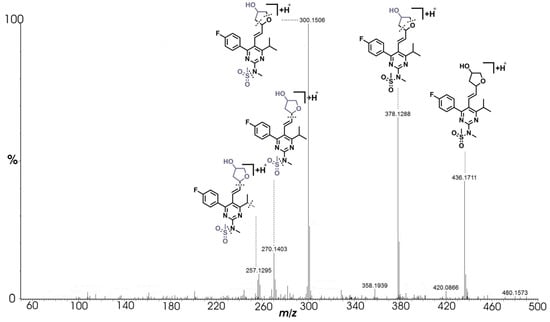 Compound F was eluted and detected at RRt 1.21 in TIC (Figure 2). The compound [M + H]+ ion signal observed at m/z 436.1711 was matched to the molecular formula C21H27N3O4FS. Based on results derived from the compound MS/MS spectra (Figure 9) and elemental composition analysis, it was concluded that product F was most likely formed by decarboxylation of compound E (Scheme 5). It is worth noticing that collision energy needed for the induction of the compound fragmentation was equal to 45 V, which is approximately two times higher than collision energy used for product E fragmentation. The cyclization of statins was previously described in a paper dealing with the influence of gamma irradiation on fluvastatin. In that work, it was suggested that the tetrahydrofuran derivative of fluvastatin is formed by the loss of CO2 followed by cyclization [23]. Contrary to this, we propose the reverse order of the processes. We suggest that first, as a result of cyclization, product E is formed, the decarboxylation of which leads to the formation of compound F. The name of product F was proposed as (E)-N-(4-(4-fluorophenyl)-5-(2-(4-hydroxytetrahydrofuran-2-yl)vinyl)-6-isopropylpyrimidin-2-yl)-N-methylmethanesulfonamide.