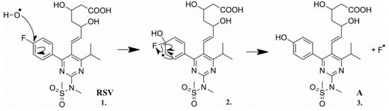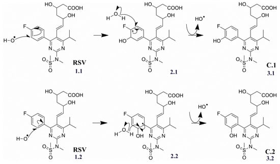 Compounds C.1 and C.2 were eluted and detected at RRt 0.88 and RRt 0.94, respectively, as it is shown in TIC (Figure 2). Accompanied MS spectra showed the presence of [M + H]+ ion signals at m/z 498.1709. The products C.1/C.2 were previously described in the literature, but mechanisms of their formation were not proposed and the position of the hydroxyl substituents in the fluorophenyl ring was not determined [29]. Elemental composition analyses of isomers C.1/C.2 were matched to the molecular formula C22H29N3O7FS. The identical MS/MS spectra of both products showed an average mass increment of 15.9943 Da in comparison to the fragmentation pattern of RSV (Figure 6). The mass increment can be explained by the addition of hydroxyl group to the fluorophenyl ring of RSV molecule. The fragment ions observed at m/z 133.0452, 189.0829, and 258.1404 were identical to the ions observed in mass spectra obtained from non-irradiated RSV sample. The named three fragments did not comprise structural information about addition of hydroxyl group to the fluorophenyl of RSV molecule. The mechanism assumes that C.1 and C.2 were formed by substitution of the hydrogen atom present in the fluorophenyl ring in the ortho- (Scheme 3 (2.1)) and meta- (Scheme 3 (2.2)) position by the hydroxyl radical. Spectra obtained after MS/MS analysis of products C.1 and C.2 did not indicate diagnostic ions and therefore did not distinguish the position of attached hydroxyl group to the fluorophenyl group of the RSV molecule. However, fragmentation pathway and ion transition m/z 286.1352 → m/z 258.1404 clearly pointed out hydroxyl group incorporation in the the fluorophenyl ring. In the literature, similar reactivity of hydroxyl radical towards chlorobenzene was previously reported [40]. Also, the ratio of the regioisomers formed in the reaction with chlorobenzene was similar to the ratio of C.1/C.2 which was found to be equal to 3/1 (Figure 2). The formation of C.1 as a proposed major isomer indicates that the inductive effect of fluorine is more efficient in the stabilization of intermediate radical formed in the substitution reaction than the resonance effect provided by the RSV pyrimidine ring. Resulted products C.1 and C.2 can be named as (E)-7-(4-(4-fluoro-3-hydroxyphenyl)-6-isopropyl- 2-(N-methylmethylsulfonamide) pyrimidin-5-yl)-3,5-dihydroxyhept-6-enoic acid for C.1 and (E)-7-(4-(4-fluoro-2- hydroxyphenyl)-6-isopropyl-2-(N-methylmethylsulfonamide) pyrimidin-5-yl)-3,5-dihydroxyhept-6-enoic acid for compound C.2.