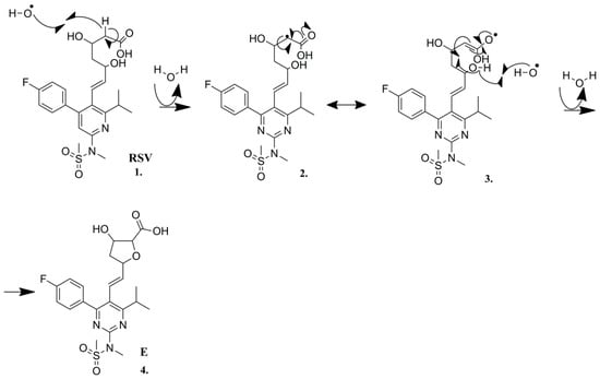 It was determined from TIC that product E eluted at RRt 1.09 (Figure 2). The compound [M + H]+ ion signal was observed at m/z 480.1600, which corresponded to molecular formula C22H27N3O6FS. Fragment ions signals observed in the product MS/MS spectra at m/z 189.0830, 300.1505, and 378.1284 (Figure 8) were also seen in the fragmentation pathway of RSV (Figure 3). The formation of a compound with the same molecular formula as found for E was previously reported, but the structure of the compound and the mechanism for its formation were not proposed [29]. Nevertheless, it was found that the product structure had a higher ring and double bond equivalent (RDB) value compared to this one of RSV (10.5 vs 9.5). Herein we propose that the product E is formed in the radical intramolecular cyclization (Scheme 4). The process is initiated by an attack of a hydroxyl radical which abstracts hydrogen atom attached to α carbon atom of the RSV heptanoic acid side chain (Scheme 4 (1)). This leads to the formation of a resonance stabilized intermediate (Scheme 4 (2)). In the next step, the abstraction of the hydrogen atom of the chain δ hydroxyl group (Scheme 4 (3)) initiates an intramolecular cyclization leading to the formation of the substituted tetrahydrofuran ring (Scheme 4 (4)). The presence of the additional ring can explain the higher RDB value found for E in comparison to RSV. Support for the structure proposed for E was also provided by the fragment ions signals observed in the compound MS/MS spectra at m/z 462.1492 (loss of hydroxyl group), 436.1700 (loss of carboxylic group), 392.1440, 378.1284, 300.1505, 270.1403 (tetrahydrofuran ring cleavages) and m/z 256.1244, 201.0826, and 149.0713 (dissociation of the entire substituted tetrahydrofuran ring). Corresponding molecular formula and structure of product E was proposed as (E)-5-(2-(4-(4- fluorophenyl)-6-isopropyl-2-(N-methylmethylsulfonamide)pyrimidin-5-yl)vinyl)-3-hydroxytetrahydrofuran-2-carboxylic acid.