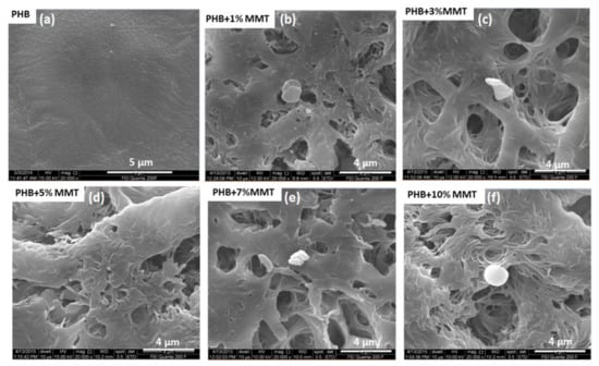 SEM images of nanocomposite films of (a) PHB control, (b) 1 wt% OMMT, (c) 3 wt% OMMT, (d) 5 wt% OMMT, (e) 7 wt% OMMT, and (f) 10 wt% OMMT.