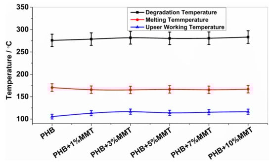 The analysis of DSC thermographs (Figure 2) showed that the degradation temperature of the blends gradually increased for the blends of OMMT from 1 wt% to 10 wt%. Particularly, the 10 wt% OMMT loading film showed a degradation temperature of approximately 283.26 °C, which was higher than the degradation temperature of pristine PHB (275.92 °C). This higher degradation temperature significantly increased the working window of the 10 wt% OMMT loading film. The analysis of endothermic heat flow showed that the energy absorbed due to degradation decreased in the blended films, demonstrating that less heat flow was required at higher temperatures for degradation, as observed in the 10 wt% blended PHB film, i.e., 46.47 mJ. The degradation temperatures of the 5 wt% and 7 wt% nanocomposites did not show much variation and remained stable (Table 1). The upper working temperature of the blends significantly improved at 10 wt%, reaching 116.44 °C, which was much higher compared to that of pure PHB whose highest working temperature was 105.52 °C. Along with an increase in the degradation temperature of all blends, their melting temperature decreased, which provides a larger working window in comparison to neat PHB. This improvement in the upper working temperature associated with a large working window may help the molding of films, which could be utilized in the preparation of various scaffolds of different shapes and sizes in the field of biomedicine. The investigation revealed that the prepared nanocomposites were far more thermostable, allowing a higher range of working temperatures. In comparison to the work by Ali et al. and co-workers [15], our blend showed improved properties. All the parameters of the DSC analysis of PHB and its blends are shown in Figure 2 and Figure 3.