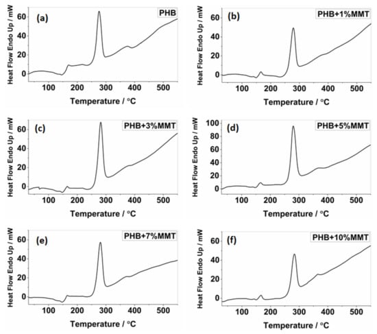 DSC thermograph showing endotherms for (a) pure PHB, (b) PHB + 1 wt% OMMT, (c) PHB + 3 wt% OMMT, (d) PHB + 5 wt% OMMT, (e) PHB + 7 wt% OMMT, and (f) PHB + 10 wt% OMMT.
