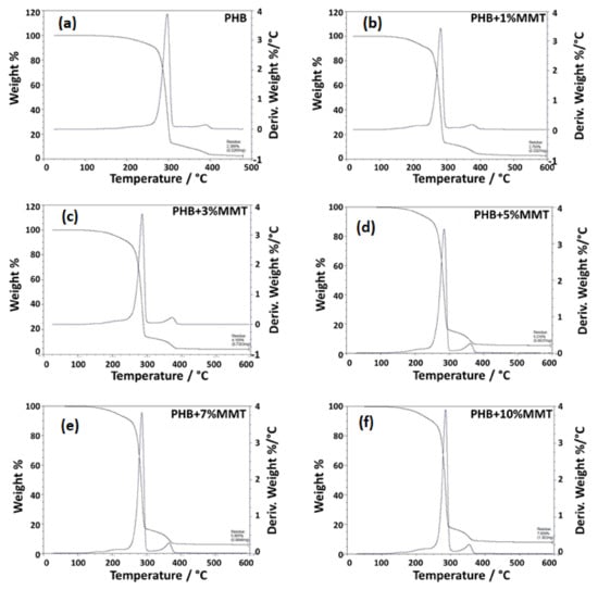 TGA thermograph showing the degradation peak of (a) neat PHB, (b) PHB + 1 wt% OMMT, (c) PHB + 3 wt% OMMT, (d) PHB + 5 wt% OMMT, (e) PHB + 7 wt% OMMT, and (f) PHB+ 10 wt% OMMT.