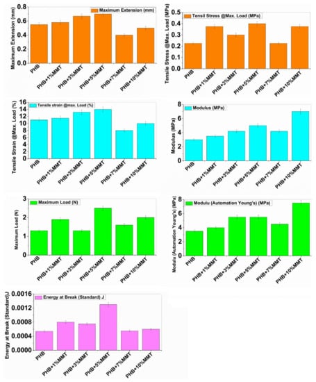 The mechanical properties of neat PHB and its different blends are depicted in Figure 5. Neat PHB showed a maximum extension of 0.5525 mm, tensile stress of 0.23 MPa, tensile strain of 11.05%, modulus (Automatic) of 3.0525 MPa, maximum load of 1.35 N, modulus (automatic Young’s) of 3.4975 MPa, and energy at break of 0.00054 J. The incorporation of OMMT within the polymeric matrix resulted in intermediate properties for the blends. However, the ductility of neat PHB increased consistently with an increase in OMMT concentration from 1 wt% to 10 wt % within the PHB matrix.