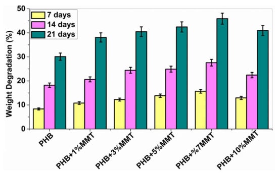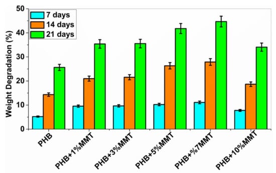 The biodegradability of PHB polymers has been of interest to many researchers, as ester bonds of polymeric materials are hydrolyzed in the presence of CO2 and H2O. More than 300 strains of microorganisms capable of degrading PHB in vitro are widely used. Among all, the genus Bacillus is superior in degrading natural polymers [28]. In the current study, the degradation of PHB and PHB/OMMT nanofilms was carried out using Bacillus subtilis (MTCC 441) procured from IMTECH Chandigarh. A 1X PBS solution was also utilized to test the biodegradation of the nanocomposite in vitro with an incubation period of 21 days. Bacterial degradation of PHB/OMMT and pure PHB films in vitro was carried out for 7, 14, and 21 days. As the percentage of OMMT in the nanocomposite increased, the weight percentage (%) degradation also increased. The results showed that in PBS all PHB/OMMT (3 wt%, 5 wt%, 7 wt%, and 10 wt%) films had a higher rate of degradation than the pure PHB film, as shown in Figure 6 and Figure 7. These results indicated that PHB composites consisting of 5 wt% and 7 wt% blends are more biodegradable compared to neat PHB in the presence of microorganisms under natural conditions. Furthermore, the higher biodegradability and associated easy disposal allow diversified applications. The PBS assay also proved that these types of material are biodegradable, biocompatible, it can be utilized to make scaffolds, as in vivo they promote the deposition of calcium ions on injury sites and later undergo degradation within body fluids.