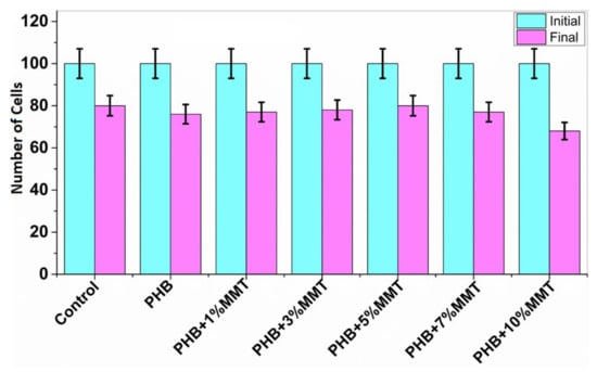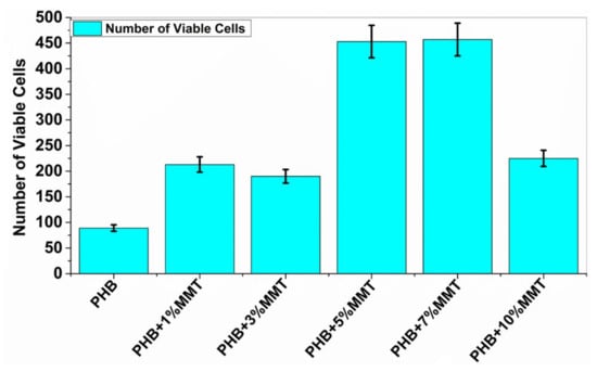 Cell viability analysis was carried out using trypan blue dye and a hemocytometer to identify the number of viable cells. The cell viability assay analyzed the interaction of blended films with microorganisms, to evaluate the biocompatibility of microorganisms with the films. This analysis indicated that the nanocomposite films are biologically compatible as they did not negatively affect the growth of the microbial cells. The assay for all the films was carried out, and it was observed that with PHB + 7 wt% OMMT, the number of viable cells was higher as compared to that observed with the rest of the blends and neat PHB. The data reported below in Figure 8 show the number of viable cells in the presence of each film. These results confirmed the compatibility of the films with biological material and their nontoxic nature.