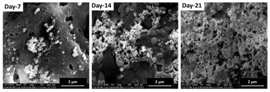 The protocol was carried out as described in the materials and methods section to check the capability of the blends to induce osteoblast growth over the materials. SBF provides a favorable environment that is comparable to the human blood plasma and allows the deposition of calcium particles (apatite layer) over a material in vitro. This assay is based on the fact that if calcium deposition takes place over a material in vitro, then this material can induce the growth of cells over itself in vivo. It can thus be utilized in implants and other bone tissue engineering applications inside the live human body. It has been already reported that zeolites can be used both in human and in veterinary medicine as biologically active food additives (dietic additives), drugs, drug carriers, adjuvants in anticancer therapy, and antimicrobial agents. They are tolerated well in the body. Our analysis showed the deposition of an apatite layer over the test material (5 wt%) in time (7, 14, and 21 days) as shown in Figure 10. This material can thus be utilized in bone tissue engineering protocols and implants.