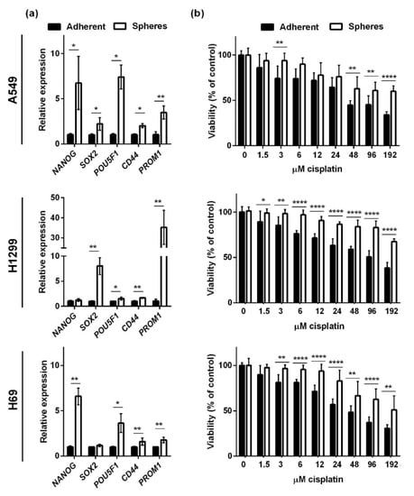 Spheroid cells express higher levels of stemness markers and are more resistant to cisplatin than adherent cells. Lung cancer cells were grown as adherent cells or spheres for 72 h. The spheroid cells expressed higher levels of the stemness markers NANOG, POU5F1 (Oct4), SOX2, CD44, and PROM1 (CD133). The results were normalized to the housekeeping genes HRPT1 and GAPDH and compared to adherent cells, whose expression level was set to 1. * p < 0.05; ** p < 0.01 as determined by t test (a). Spheroids or adherent cells were incubated with increasing concentrations of cisplatin (0–192 µM) for 24 h. Cell viability was measured with CellTiter-Blue and normalized to either untreated adherent cells or spheres (b). Results are shown as the mean ± SD of three independent experiments. * p < 0.05; ** p < 0.01; **** p < 0.0001 compared to adherent cells as determined by t test.