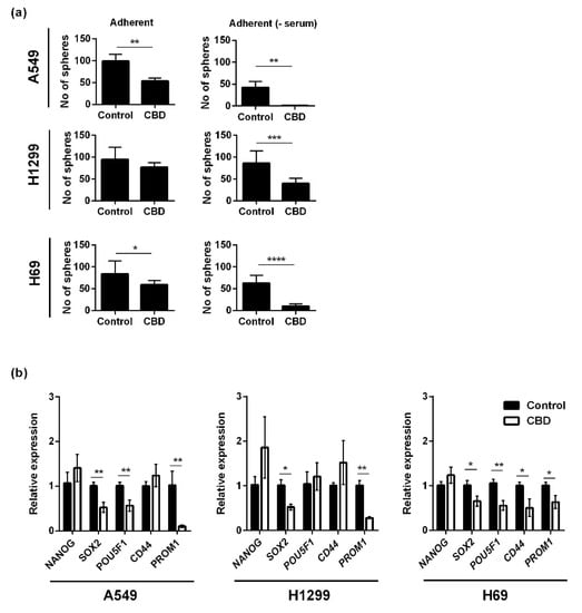 CBD decreases sphere formation and the expression of cancer stem cell genes. Adherent cells were treated with 10 µM CBD for 24 h in the presence or absence of serum. Next, the cells were trypsinized and seeded as spheres and incubated for 7 days and counted (a). The result is shown as the mean number of spheres ± SD of three independent experiments. * p < 0.05, ** p < 0.01, *** p < 0.001, **** p < 0.0001 as determined by t test. Lung cancer spheres were incubated with 10 µM CBD for 24 h, and the expression of the cancer stem cells genes NANOG, SOX2, POU5F1 (Oct4), CD44, and PROM1 (CD133) were analyzed and normalized to the housekeeping genes HPRT1 and GAPDH and compared to control cells, whose expression level was set to 1 (b). The results are shown as the mean ± SD of three independent experiments. * p < 0.05, ** p < 0.01 as determined by t test.
