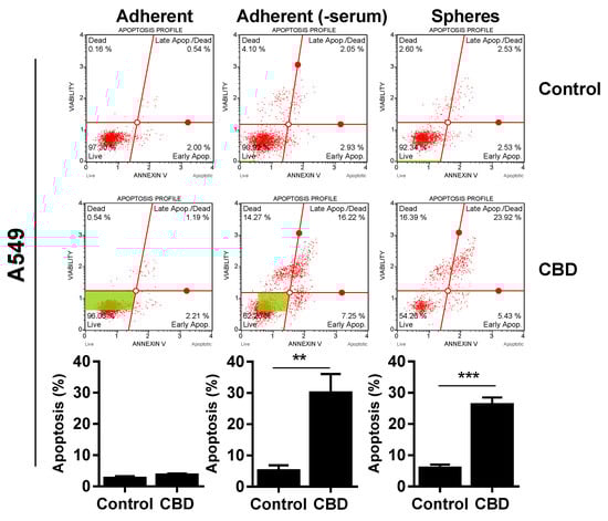 Since CBD reduced viability, we wanted to determine if the effect was cytotoxic, so we performed an AnnexinV and cell death analysis. For A549, Annexin-positive cells significantly increased to approx. 30% after 24 h of 10 µM in the spheres (Figure 4, upper panel) and adherent cells incubated in the absence of serum (Figure 4, upper panel). We did not see any significant apoptosis in the adherent cells in the presence of serum (Figure 4, upper panel).
