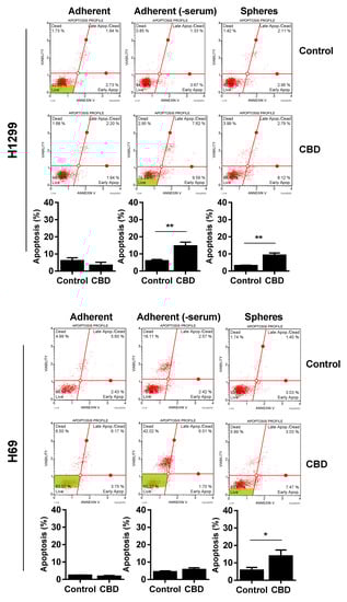 There was also a significant increase in apoptotic cells in the H1299 spheres and H1299 cells grown without serum, although the increase was smaller (increased to approx. 10–15%; p < 0.01; Figure 4, middle panel). For H69, there was only a significant increase in apoptotic cells in the spheres (p < 0.05), whereas cells without serum were not Annexin-positive (Figure 4, lower panel). In contrast, there was a pronounced increase in dead cells negative for Annexin, especially in the H69 cells grown without serum. Overall, these results suggest that CBD induces apoptosis in the lung cancer spheres.