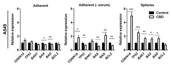 To further delineate the mechanism by which CBD induced apoptosis, we analyzed the expression of selected anti- and pro-apoptotic genes in A549 cells after treatment with 10 μM CBD for 24 h. We also included TP53 and its target gene p21 (CDNK1A), which previously were shown to be affected by CBD [21,22]. In the adherent cells in the presence of serum, CBD decreased BAK1 and BAX expression by 1.25-fold (p < 0.05 for BAK1 and p < 0.01 for BAX1; Figure 6, left panel), whereas there were no significant changes in the expression of BCL2, BAD, CDKN1A, and TP53. In the adherent cells, in the absence of serum, CBD increased the expression levels of CDKN1A and BAD two-fold (Figure 6, middle panel). Furthermore, the expression of TP53, BAX, and BCL2 decreased significantly (p < 0.01) in the adherent cells in the absence of serum. In the non-adherent cells, the pro-apoptotic genes BAK1, BAX, and BAD were significantly upregulated by approximately 1.8-fold (p < 0.01 for BAK1 and p < 0.05 for BAX and BAD). In contrast, the expression of the anti-apoptotic BCL2 slightly decreased, although not significantly (Figure 6, right panel). CBD induced a three-fold increase in the expression of TP53 (p < 0.001) and a five-fold increase in its target gene CDKN1A (p < 0.001) in the non-adherent cells (Figure 6, left panel). TP53 is upregulated, among other things, in response to DNA damage; however, we could not detect any phospho-H2AX foci (a marker for double-strand DNA breaks) in A549 cells at 24 h (Supplementary Figure S2). Although, we also detected a significant increase in the cyclin-dependent kinase inhibitor CDKN1A expression level, we could not detect a change in cell cycle distribution (results not shown).