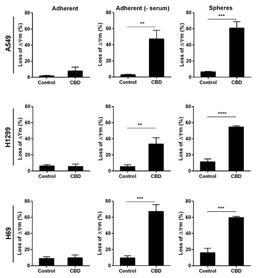 Finally, we tested the mitochondrial membrane potential since the destruction of mitochondria can lead to increased oxidative stress. Loss of mitochondrial membrane indicates healthy intact mitochondria, and low membrane potential indicates permeable mitochondria. Adherent and non-adherent cells were treated with 10 μM CBD for 24 h and analyzed. There was a more significant loss in mitochondrial membrane potential (60%) in all the non-adherent cells compared to control cells (p < 0.001 and p < 0.0001, Figure 8, right panel), whereas the adherent cells in the presence of serum remained unaffected (Figure 8, left panel). For the adherent A549 cells, in the absence of serum, there was a 45% loss of membrane potential, a 40% loss in H1299 cells, and a 70% loss in H69 cells (Figure 8, middle panel). These results support that CBD leads to mitochondrial damage in the adherent cells in the absence of serum and in the spheres.