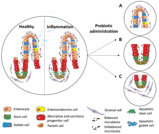 During the last years, the manipulation of IBD has been revolved around therapeutic applications that aim to induce and maintain remission, while also confining surgery []. Due to the fact that IBD’s etiology is unclear, the drugs that have been developed until now do have not any etiopathologic basis, but they aim to dampen the recusant inflammatory response []. These drugs mainly include a wide variety of immunosuppressive agents (e.g., azathioprine), anti-inflammatory compounds (e.g., corticosteroids), and biologics (e.g., anti-TNFα antibody) [,,]. However, current therapy is deficient, as, in many cases, patients relapse, require surgery, and disease recurs after surgery []. Recent studies indicate that the restoration of gut microbiota imbalance is important in the management of certain manifestations of chronic intestinal inflammation, and it gives room to probiotics in the quiver of IBD treatments. The aim of this review was to present the current knowledge regarding the role of gut microbiota and their metabolites in intestinal wound healing and to discuss the dynamics of probiotics in the intestinal mucosal wound closure through the restoration of dysbiosis.