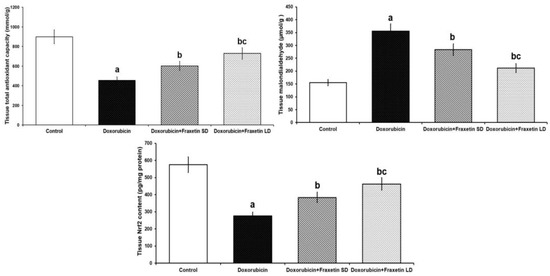 Effect of the different doses of fraxetin on total antioxidant capacity, malondialdehyde, and Nrf2 content of cardiac tissues in doxorubicin-treated rats (Mean ± SD). a Significant relative to the control group (p-value less than 0.05); b Significant relative to doxorubicin group (p-value less than 0.05); c Significant relative to doxorubicin + fraxetin small dose group (p-value less than 0.05).