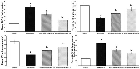 The injected doxorubicin elicited significant increase in cardiac tissue TGF-β1 and NLRP3 inflammasome with significant decrease in IL-10 and IFN-α levels when compared with the control group. Fraxetin, in a dose-dependent manner, had detrimental effects on TGF-β1 and NLRP3 inflammasome levels with significant increase in IL-10 and IFN-α levels resulting in amelioration of the inflammatory processes compared to rats treated with doxorubicin alone (Figure 2).