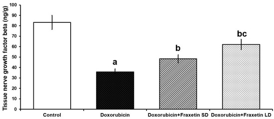 Effect of the different doses of fraxetin on nerve growth factor beta of the cardiac tissues in doxorubicin-treated rats (Mean ± SD). a Significant relative to the control group (p-value less than 0.05); b Significant relative to doxorubicin group (p-value less than 0.05); c Significant relative to doxorubicin + fraxetin small dose group (p-value less than 0.05).