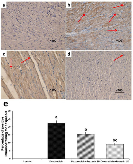 Immunohistochemical staining of caspase-3 in the left ventricle of (a) the control group showing negative immunoexpression of caspase-3; (b) Doxorubicin-treated group showing strong positive expression of caspase-3 in the form of deep brown discoloration of the cytoplasm of the cardiomyocytes (Arrows); (c) Doxorubicin + Fraxetin small dose group showing weak uptake of the stain by the cardiac myocytes, which appeared as mild brown discoloration of their cytoplasm (Arrow); (d) Doxorubicin + Fraxetin large dose group showing mild positive immunoexpression of caspase-3 (Caspase-3 × 400); and (e) Percentage of positive immunostaining for caspase-3 (a Significant relative to the control group; b Significant relative to doxorubicin group; c Significant relative to doxorubicin + fraxetin small dose group).
