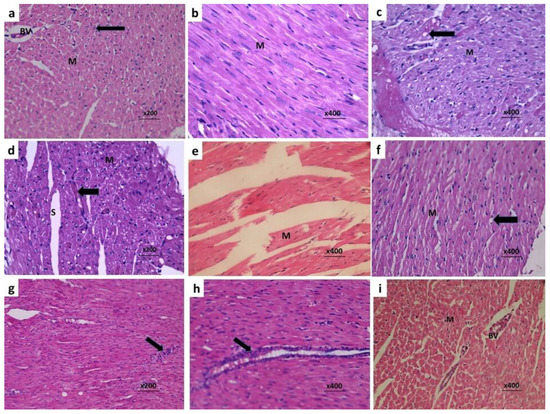 Sections of the cardiac tissues from (a) The control group showing transversally cut section of some cardiac muscle fibers (M) with centrally located nuclei (Arrow) and normal-sized blood vessels in between (BV) (H&E × 200); (b) The control group showing some cardiac muscle fibers appear longitudinally cut (M) with acidophilic cytoplasm and basophilic central nuclei. The cardiac muscle fibers appear connected and closely adherent (H&E × 400); (c) Doxorubicin group showing transversely cut cardiac muscle fibers (M) with marked cytoplasmic vacuolations (Arrow) (H&E × 400); (d) Doxorubicin group showing transversely cut cardiac muscle fibers (M) with wide spaces between them (S) and evident interstitial hemorrhage (Arrow) (H&E × 200); (e) doxorubicin group showing longitudinally cut cardiac muscle fibers, which appear disorganized into widely separated fragmented bundles (F) (H&E × 400); (f) Doxorubicin + fraxetin small dose group showing preserved normal architecture of the cardiac muscle fibers, which appear longitudinally cut (M) with mild cytoplasmic vacuolation (Arrow) (H&E × 400); (g) Doxorubicin + fraxetin small dose group showing mild interstitial cellular infiltration (H&E × 200); (h) Doxorubicin + fraxetin large dose group showing mild perivascular cellular infiltration (H&E × 400); (i) Doxorubicin + fraxetin large dose group showing transversally cut cardiac muscle fibers (M) with centrally located nuclei and normal blood vessel (BV) in between (H&E × 400).
