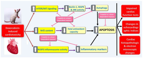 Fraxetin may be considered as a new adjuvant line of therapy on the way to abrogate doxorubicin-induced cardiotoxicity. This might be due to its effects on ROS production with subsequent affection of NLRP3 inflammasome activity, which is the center point of the pathogenic events that occur in the myocardium of doxorubicin-treated animals. In addition, modulation of autophagy/apoptosis balance may be another mechanism by which fraxetin might restore cardiac functions (Figure 7). Further work is vitally needed to delineate the exact mechanisms that may underlie these desirable effects and to plan future clinical applications.