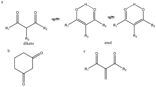 β-Diketones can be obtained from natural sources such as plants, fungi, or bacteria, but can also be synthesized. The synthesis of the simple β-diketones is usually not complicated [,]. A number of reviews have discussed tautomerism and biological effects [,,,,,].