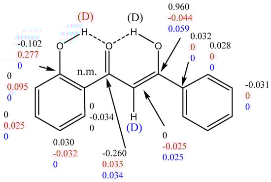 To determine the ratio between the two enolic forms, partial deuteration of the enol proton and measurement of deuterium isotope effects on 13C chemical shifts is a very useful tool. An example is seen in Figure 3 []. We see three different kind of isotope effects. The lower set of numbers is caused by deuteration at C-2. The fact that C-2 is deuterated is direct evidence that the keto-form and the enol-form are in equilibrium. The middle set of isotope effects is caused by deuteration at OH-2´. This effect is an indicator of hydrogen bond strength. These two types of isotope effects are the so-called intrinsic isotope effects. The top set of data are due to deuteration at the chelate OH group. The intrinsic isotope effect of this strong hydrogen bond is close to 0.5 ppm. However, the deuteration leads to a shift in the chemical equilibrium and therefore also to an equilibrium isotope effect []. Using the graph of [], the mole fraction of the two enol-forms can now be determined.