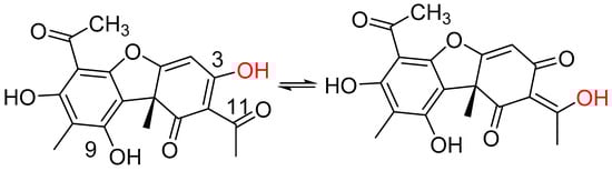 Enolic forms of usnic acid. Enolic proton marked with red.