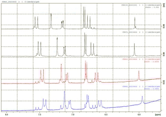1H NMR spectra of curcumin in a mixture of H2O and DMSO-d6. From top, 0%, 25%, 50%, 55% H2O. The major form is the enol-form. The diketo-form is seen as the minor resonances.