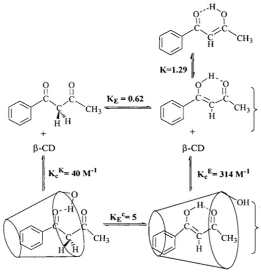 Benzoylacetone complexation with β-cyclodextrin. E refers to enol- and K to diketo-form. Taken from [] with permission from the American Chemical Society.