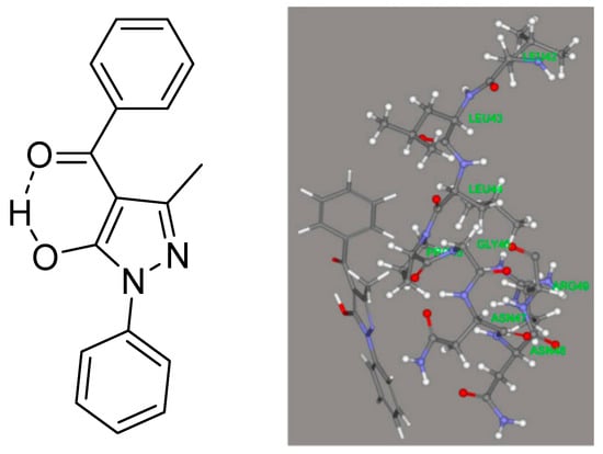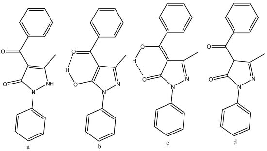 Caruso et al. [] compared X-ray data and DFT data for 4-benzoyl-3-methyl-1-phenylpyrazol-5-one (see Figure 7) and found especially for the diketo-form an excellent agreement between structures determined by X-ray and calculated structures. The effect of water was taken into account using the COSMO algorithm []. DFT calculations were used to discuss the structure of 4-furancarbonyl, 4-t-butylcarbonyl, 4-(3-cyclopentylpropanoyl), and 4-tert-butylacetyl of 3-methyl-1-phenylpyraxol-5-ones.