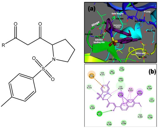 Top: One enol-form of HQPh and the preferred tautomer docked to the ICAM-1 protein from []. With permission from Elsevier. Bottom: β-Diketones derived from L-proline. R can be phenyl, p-toluene, p-Cl, Br, I-phenyl, 2,4-difluoro- and 2,4-dichorophenyl, 2-fluoro-4-bromo- and 2-methyl-4-iodophenyl, and 2-furanyl and 2-naphthyl-6-methoxy. Docking of the latter in the binding site of PTK6. (a). Showing the docking. (b). Showing the amino acid involved. Taken from [] with permission from Elsevier.