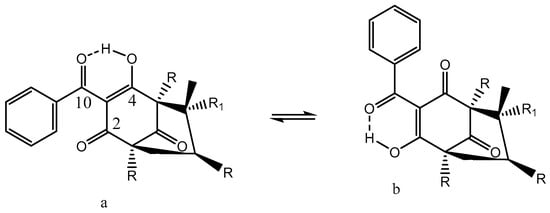 Tautomeric equilibrium of garciniaphenone (R = isoprenyl and R1 = methyl) and 7-epi-clusianone (R = isoprenyl, R1 = H). (a,b) are different positional enol isomers.