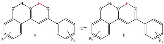 Interconversion between the two enol-forms is very fast due to the very low barrier. It has never been possible to observe the two enol-forms separately by NMR, but they can be measured by femtosecond absorption in the ultraviolet range []. However, the interconversion between the enol and the keto-form is slow on the NMR time scale. The barrier for interconversion for acetylacetone has been calculated as 62 Kcal, but with water present, it was ≈30 Kcal []. Conradie et al. [] determined the first-order rate constant for conversion of the enol to keto-form for R1 = R2 = 2-thienyl as 3.1 × 10−5 s−1 and for R1 = 2-thienyl and R2 = phenyl as 2.6 × 10−6 s−1. Katritzky et al. [] discussed general rules for observing the two tautomers. Obviously, if the rate is slow compared to the biological time scale, both tautomers should be considered separately. However, if it is fast, it does not really matter.