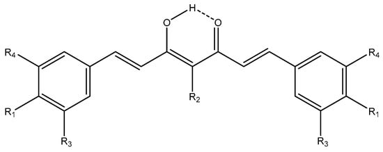 Many recent reviews deal with curcumin [,,,]. Another recent review found that taking curcumin would increase the expression of anti-metastatic proteins []. Curcumin belongs to the Pan-Assay Interference Structures (PAINS) family []. In the present paper, only very recent papers are discussed specifically. Important features of curcumin are the existence of both diketo-form and enol-forms. A recent study [] investigated a large series of curcumin analogues (Figure 12). Probabilities to act as antineoplastic, prostate cancer treatment, and anticarcinogenic agents was studied theoretically by applying a selection of quantitative structure–activity relationship and absorption, distribution, metabolism, and excretion (ADME) approaches. For the compounds, the enol-form is generally the more effective. They are good against prostate cancer (see Figure 13). With regard to substituents, the more OH and OCH3 groups, the better.