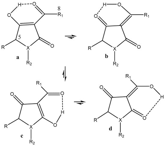 Tautomeric equilibria of 3-acyl tetronic (X=O) and tetramic (X=N) acids. (a–d) are the different enolic forms.