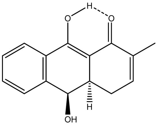 The dihydroanthracen-1(4H) one (Figure 16) isolated from Rubia philippinensis is an inhibitor of soluble epoxide hydrolase (sEH). The structure was given as a single tautomer [] but has been suggested to exist as a tautomeric equilibrium [].