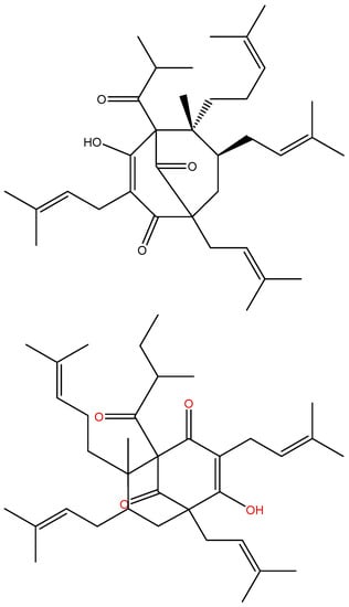 In cyclohexane, a 30:70 mixture of a/b exists, whereas in DMSO-d6, the compound is fully on form b. (-)-(R)-humulone (one R is an OH group, which is pointing inwards) and lupulone inhibit cell growth and induce caspase-dependent apoptosis []. A similar finding was uncovered for garciniaphenone and for 7-epi-clusianone (Figure 10). Both compounds show strong intramolecular hydrogen bonds. Both forms a and b could be observed in the 1H NMR spectrum (OH chemical shifts, 17.90 and 17.35 ppm). This means that the tautomeric exchange is rather slow. The two tautomers exist in a ratio of 5:1 for a/b []. The structure was also confirmed by an X-ray study []. A similar behavior was found for guttiferones A-E and clusianone [,]. Guttiferone A, a similar compound, shows HIV-inhibitory properties []. Guttiferone A, garciniaphenone, and 7-epiclusianone are discussed together with many other natural products as cathepsin inhibitors [,].